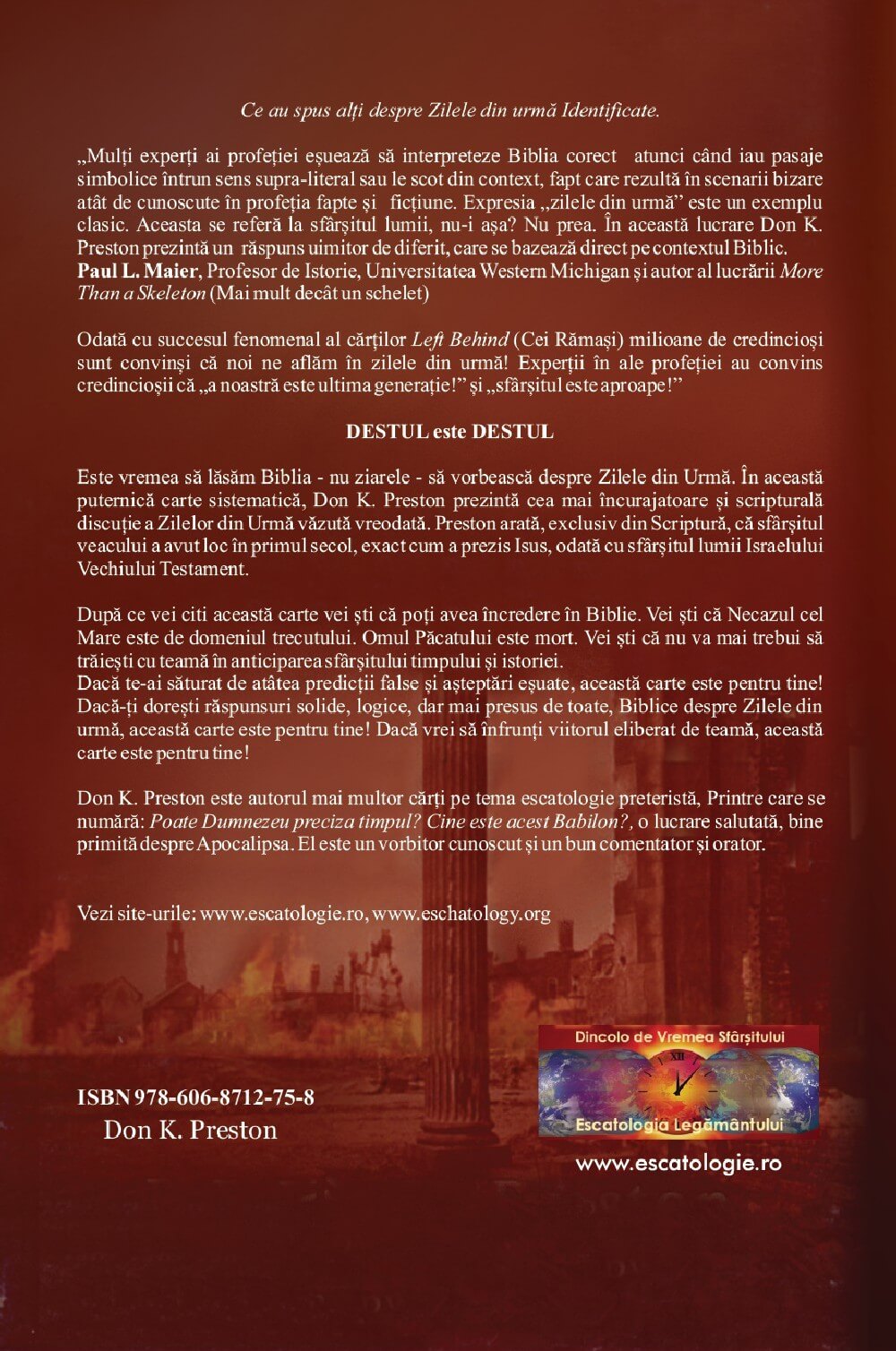 În această puternică carte sistematică, Don K. Preston prezintă cea mai încurajatoare și scripturală discuție cu privire la Zilele din Urmă văzută vreodată. Preston arată, exclusiv din Scriptură, că sfârșitul veacului a avut loc în primul secol, exact cum a prezis Isus, odată cu sfârșitul lumii Israelului Vechiului Testament.
